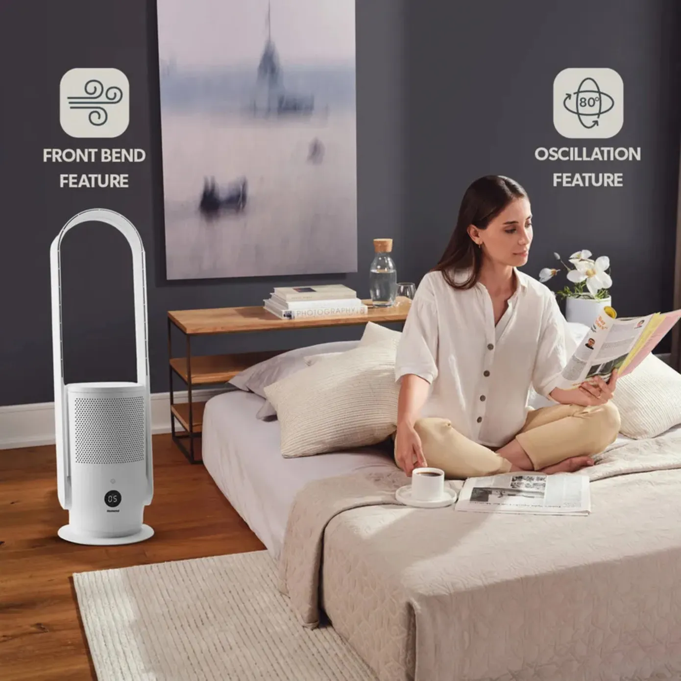 Met zijn 80 graden rechts-links oscillerende beweging, levert uw luchtreiniger schone lucht naar elke hoek van de omgeving.